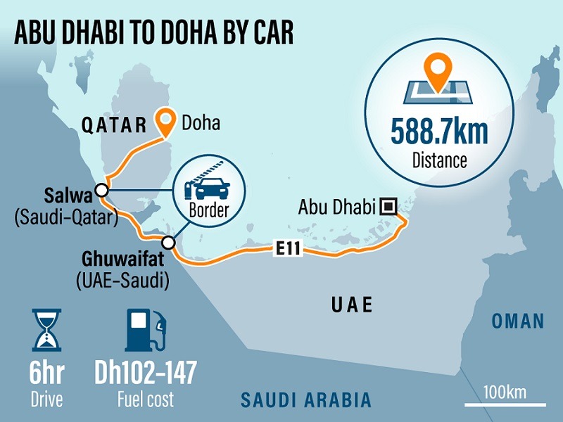 A traveller whose flight from Dubai has been cancelled may find it easier to reach another functioning airport by road. If departures from Doha are limited, driving towards Oman or southern Saudi Arabia may offer an alternative route to catch an international flight.